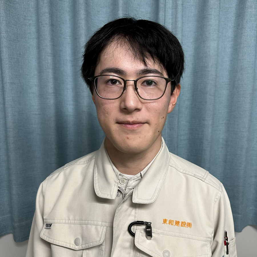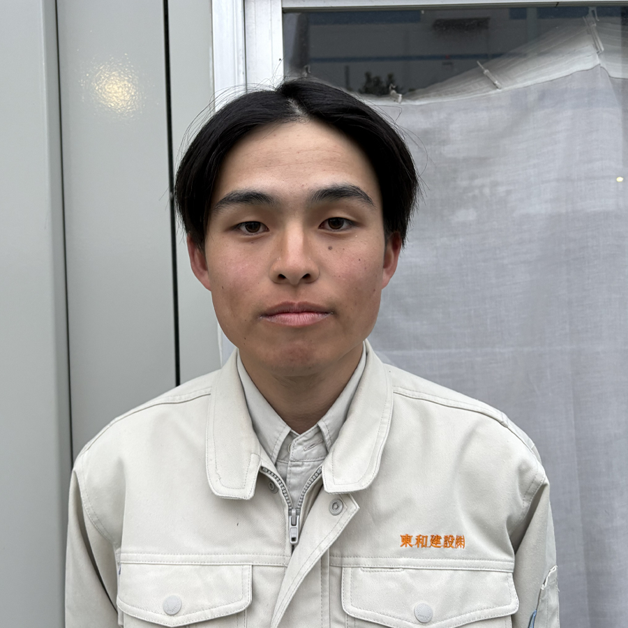 私は工業高校を卒業し、東和建設株式会社に入社しました。専門的な知識があまりなかった私は現場に配属された初めは右も左も分からない状態でしたが、現場の先輩方や職人の方々が道具の名前や作業内容を丁寧に教えていただき、少しずつ現場の作業を学んでいます。現場では、元請の方や職人の方と日々打ち合わせを行い、事故事象が起こらないように工事を進めています。日々の中で私たちが造り上げていく構造物が完成していくのを見ることでやりがい等を感じることができるのがこの仕事の良いところだと思います。また、社内間の交流も盛んで先輩方に相談しやすく 一人で抱え込まないところが、この会社の良いところだと思います。